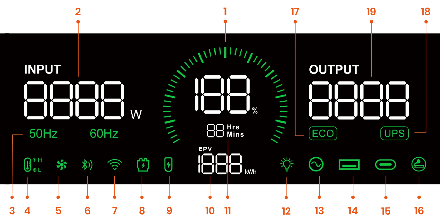 - ECO-modus geeft prioriteit aan batterij- en zonne-energie met intelligente bypass-schakeling en lage-batterijbescherming, wat zorgt voor een stabiele stroomvoorziening, maximale energie-efficiëntie en een langere levensduur van de batterij.